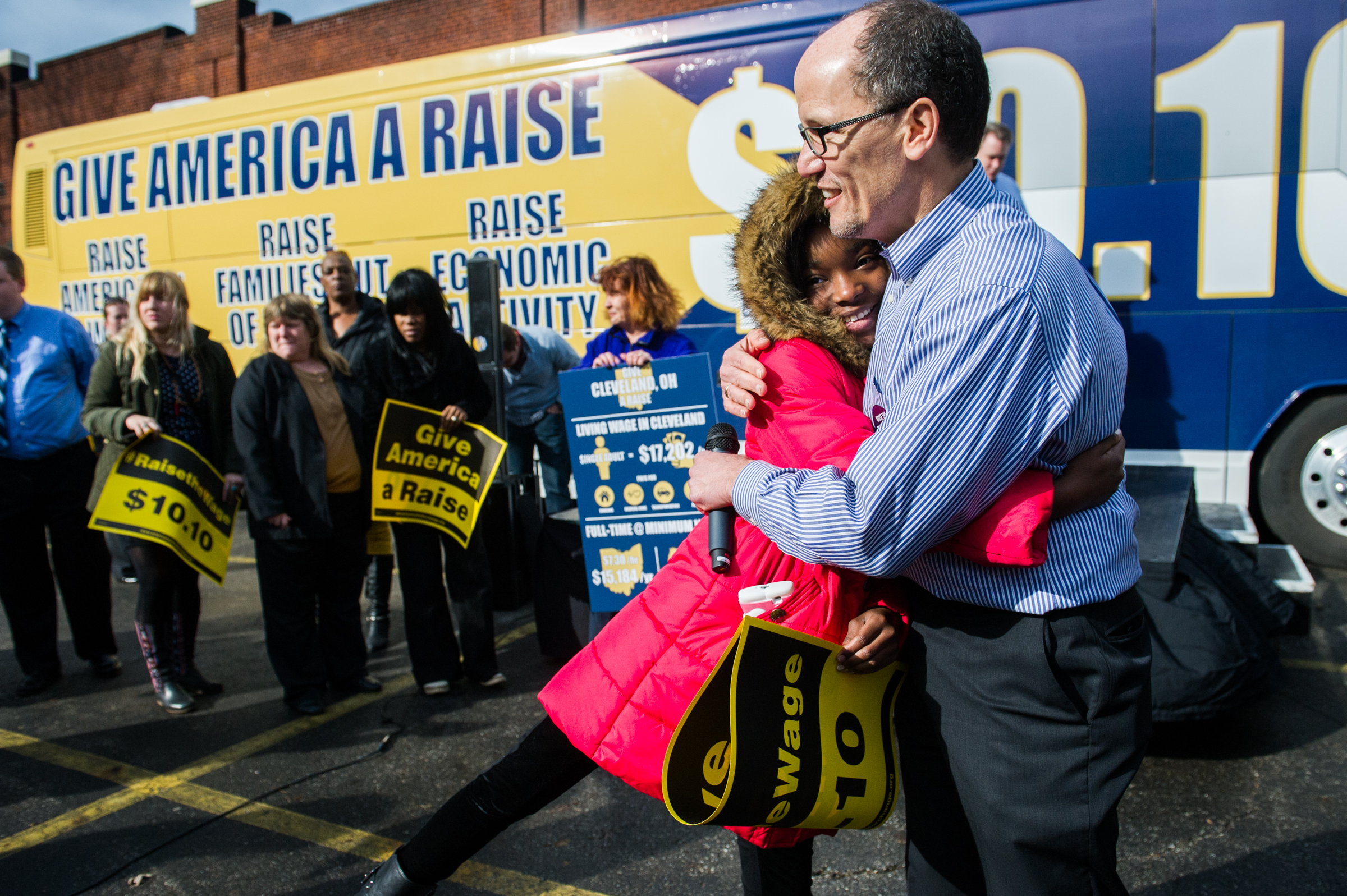 Secretary of Labor Thomas E. Perez hugs Jesseca Hudson, 11, of Cleveland after talking at the SEIU District 1199 building in Cleveland on Friday March 28, 2014.